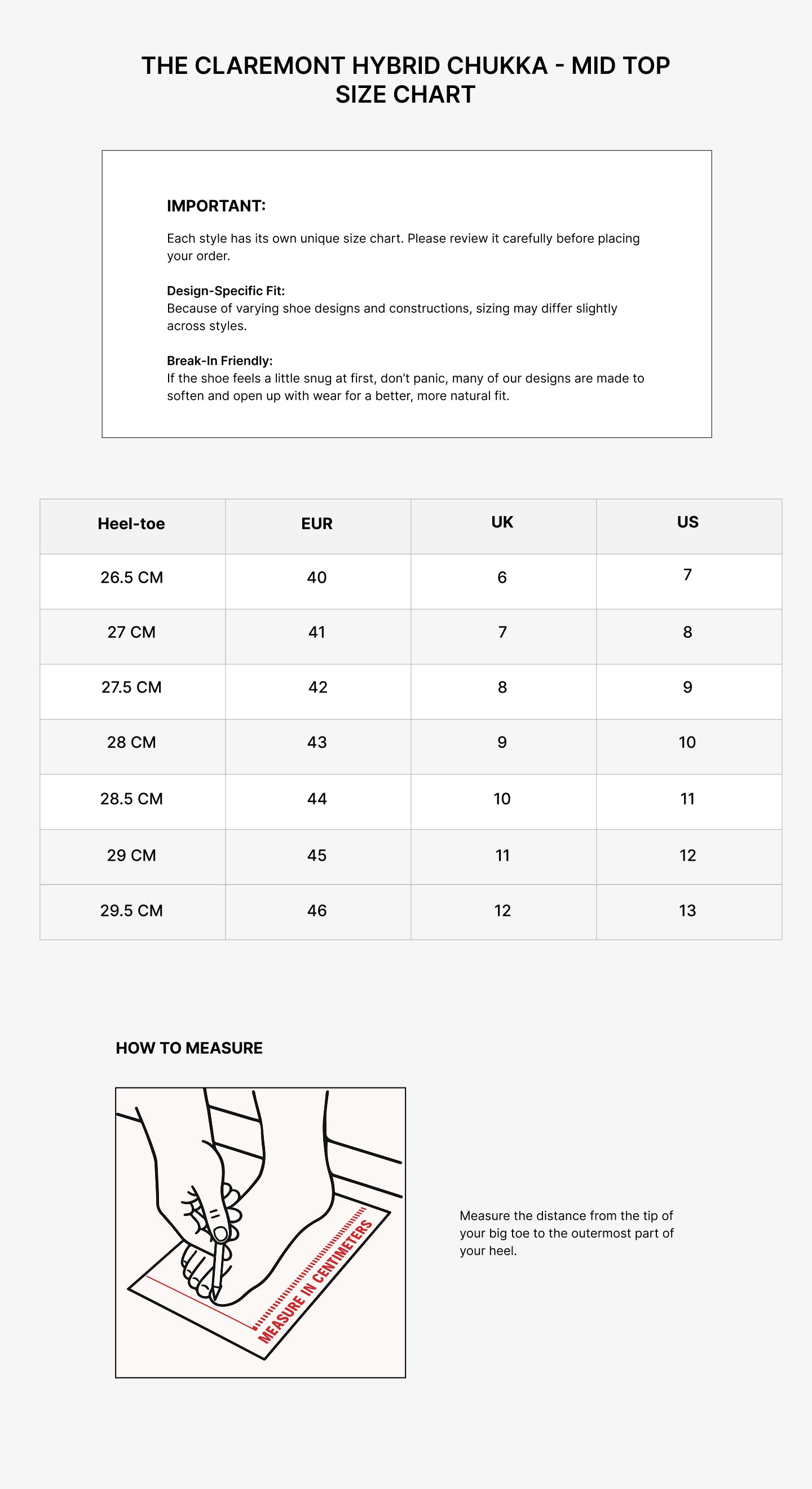 It’s time your footwear worked as hard as you do. The Claremont Hybrid Chukka is engineered to be the ultimate multitasker, merging the polished aesthetic of a classic boot with the all-day comfort of your favourite sneakers. Crafted from soft yet durable premium vegan leather and grounded by a rubber outsole, it’s the perfect solution for a life that’s always on the move. With our signature Ergo Comfort insoles providing superior cushioning, you’ll never have to choose between style and comfort again.